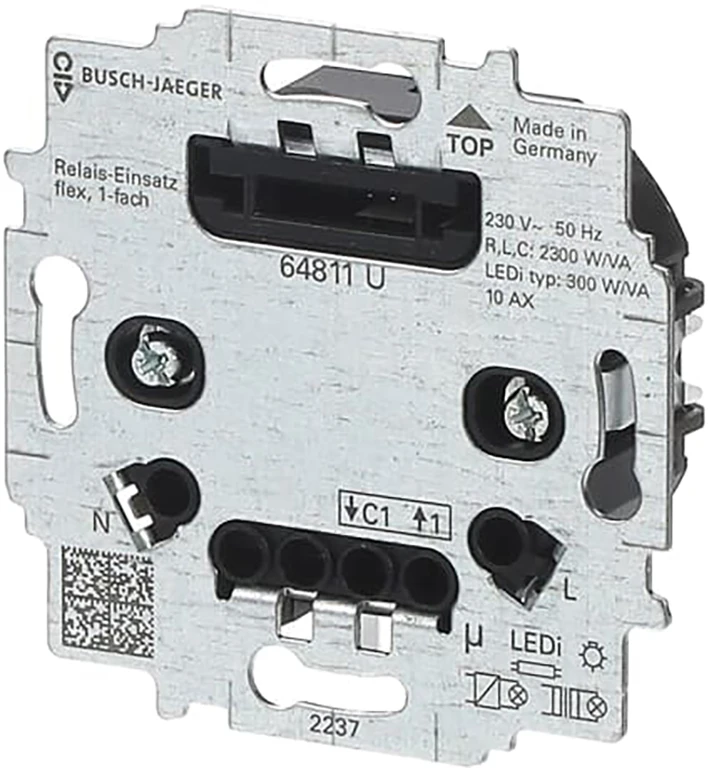 Busch flexTronics relaissokkel 1-voudig 3-draads (nuldraad vereist) t.b.v. besturen rolluik-, relaisso- of markiesmotor met mechanische of electronische eindschakelaar. |