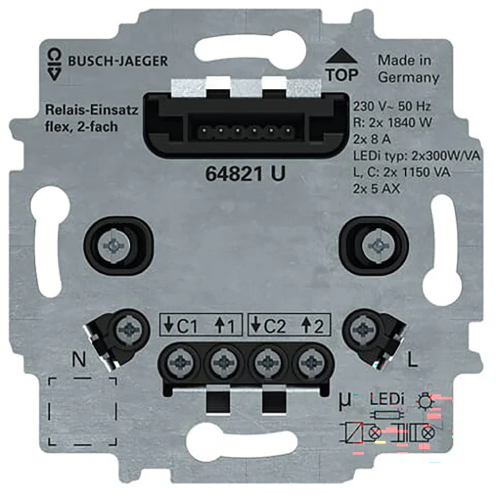 Busch flexTronics relaissokkel 2-voudig 3-draads (nuldraad vereist) t.b.v. besturen rolluik-, relaisso- of markiesmotor met mechanische of electronische eindschakelaar. |