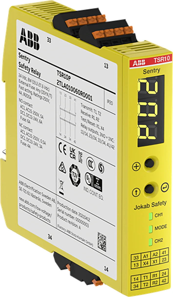 Sentry TSR10P veiligheidsrelais met vertraagbare relaisuitgangen 3 NO + 1 NC, voeding +24 VDC en push-in veerklemmen. Voor bewaking van veiligheidsinrichtingen met contacten, 1 of 2 gelijkwaardige kanalen, en veiligheidsinrichtingen met OSSD‑uitgangen. Timerfunctie 0–999 s met een nauwkeurigheid beter dan 1%: uitschakelvertraging (OFF-delay), inschakelvertraging (ON-delay), time bypass en time reset. Een display aan de voorzijde vereenvoudigt configuratie en foutopsporing door foutcodes en een foutlogboek te tonen. Een aangepaste configuratie kan met een wachtwoord worden beschermd. Alleen automatische resetfunctie. Sentry‑veiligheidsrelais dekken uiteenlopende veiligheidstoepassingen tot PLe / SIL3. Basismodellen bieden betrouwbare bewaking van eenvoudige veiligheidsfuncties, terwijl universele modellen geavanceerde functies en hoge flexibiliteit bieden. Modellen met display bieden vooraf ingestelde configuraties en uitgebreide informatie om foutopsporing verder te vereenvoudigen. Aanvullende varianten bieden een timerfunctie met hoge nauwkeurigheid van ±1% en een instelbaar tijdsbereik van 0–999 s. De hoge uitgangsstroom tot 6 A kan het gebruik van een tussencontactor besparen. Multi‑reset maakt het mogelijk tot 10 veiligheidsrelais op één reset‑lichtknop aan te sluiten. Alle modellen zijn leverbaar met afneembare push‑in‑ of schroefklemmen. Klemmen en een codeerset om verwijderde klemmen te markeren zijn als accessoires verkrijgbaar. |