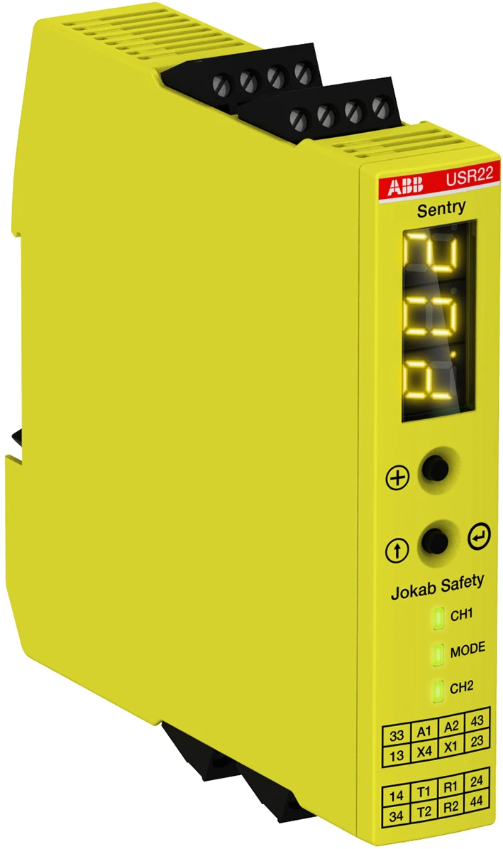 Sentry USR22 universeel veiligheidsrelais met relaisuitgangen 2 NO + 2 vertraagbare NO, voedingsspanning +24 V DC en schroefaansluitingen. Voor bewaking van veiligheidsvoorzieningen met contacten, 1 of 2 equivalente of antivalente kanalen, veiligheidsvoorzieningen met OSSD‑uitgangen, tweehandbedieningen, veiligheidsmatten en veiligheidsranden/bumpers. Timerfunctie 0–999 seconden met betere nauwkeurigheid dan 1%: uitschakelvertraging (OFF‑delay), inschakelvertraging (ON‑delay), tijd‑bypass en tijd‑reset. Een display aan de voorzijde vereenvoudigt configuratie en foutopsporing door foutcodes en het foutenlogboek weer te geven. Een aangepaste configuratie kan met een wachtwoord worden beschermd. Handmatige of automatische reset selecteerbaar. Sentry‑veiligheidsrelais dekken uiteenlopende veiligheidstoepassingen tot PLe / SIL3. Basismodellen bieden betrouwbare bewaking van eenvoudige veiligheidsfuncties, terwijl universele modellen geavanceerde functies en hoge flexibiliteit bieden. Modellen met display bieden voorinstellingen en uitgebreide informatie om foutopsporing verder te vereenvoudigen. Aanvullende varianten bieden een timer met hoge nauwkeurigheid van ± 1% en een instelbaar tijdsbereik van 0–999 s. De hoge uitgangsstroomcapaciteit tot 6 A kan het gebruik van een tussencontactor besparen. Multi‑reset maakt het mogelijk tot 10 veiligheidsrelais op één verlichte resetdrukknop aan te sluiten. Alle modellen zijn verkrijgbaar met afneembare push‑in‑ of schroefaansluitingen. Klemmen en een coderingskit om verwijderde klemmen te markeren zijn als accessoires beschikbaar. |