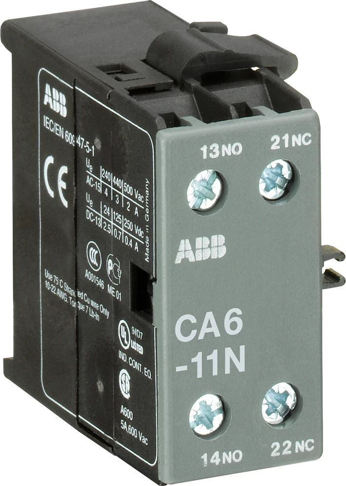 CA6-11N is een hulpcontact voor zijmontage, met 2 hulpcontacten en schroefklemmen. |