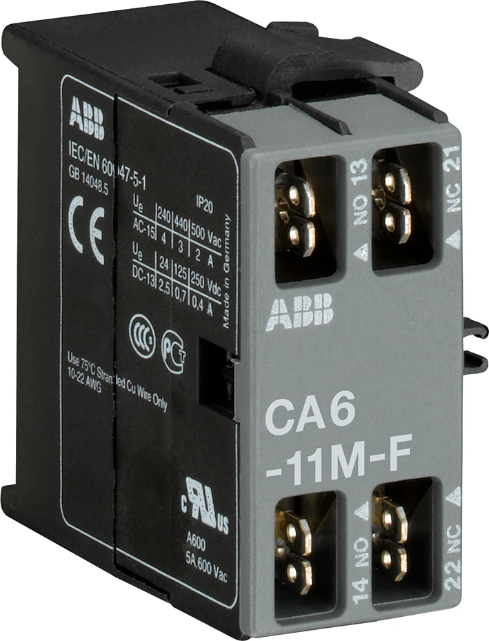 CA6-11M-F is een hulpcontact voor montage aan de zijkant, met twee hulpcontacten en een vlakke penaansluiting. |