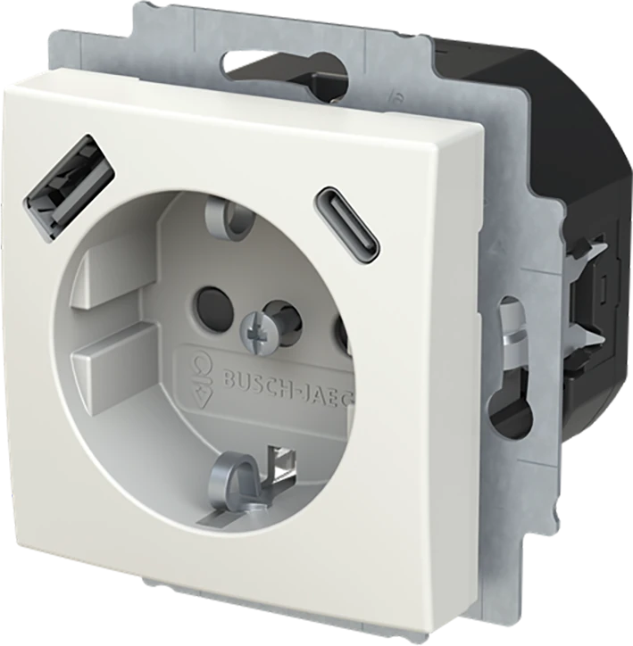 Inbouw wandcontactdoos met randaarde, met verhoogde aanraakbeveiliging, met 1x USB-A en 1x USB-C voeding, SI-Balance. |