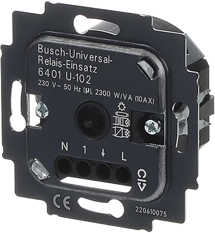 Busch universele relaisInbouwsokkel, 3-draads aansluittechniek (nuldraad vereist), 10 A, inbouwsokkel. |