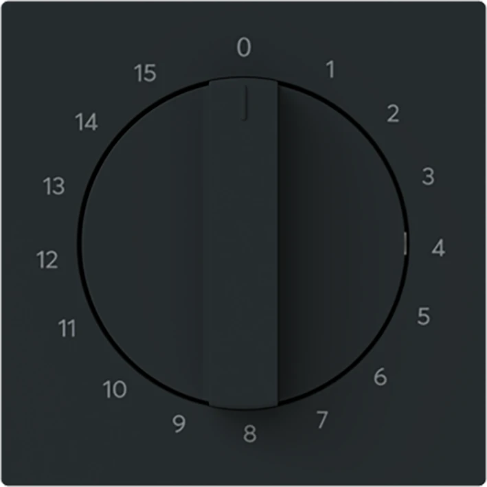 Centraalplaat met draaiknop, met opdruk Voor Busch-tijdschakelkloksokkel (mechanisch) 1070 U. Looptijd: 15 min. art-matzwart. |