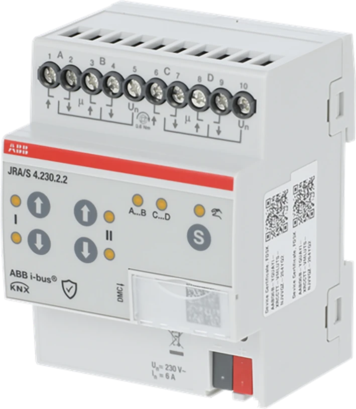 KNX jaloezie-/rolluikaktor, 4-voudig, handbediening, 230 V AC, 6 A, DIN-rail, KNX Data Secure. |