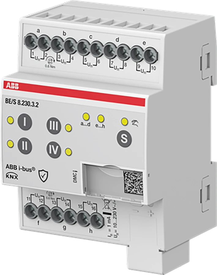 KNX binaire ingang, 8-voudig, voor potentiaal gebonden contacten, ingangsstatusweergave via gele leds, 10-230 V AC/DC, DIN-rail, KNX Data Secure. |