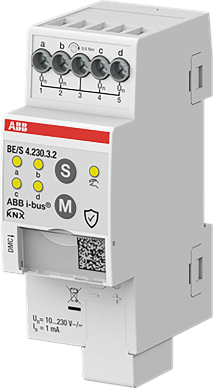KNX binaire ingang, 4-voudig, voor potentiaal gebonden contacten, ingangsstatusweergave via gele leds, 10-230 V AC/DC, DIN-rail, KNX Data Secure. |