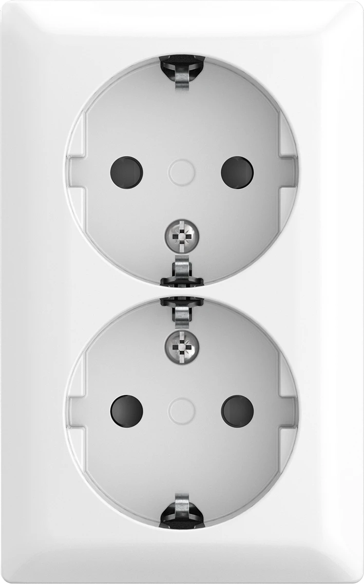 Opbouw wandcontactdoos met randaarde dubbel, kindveilig, b-AP alpine wit. |
