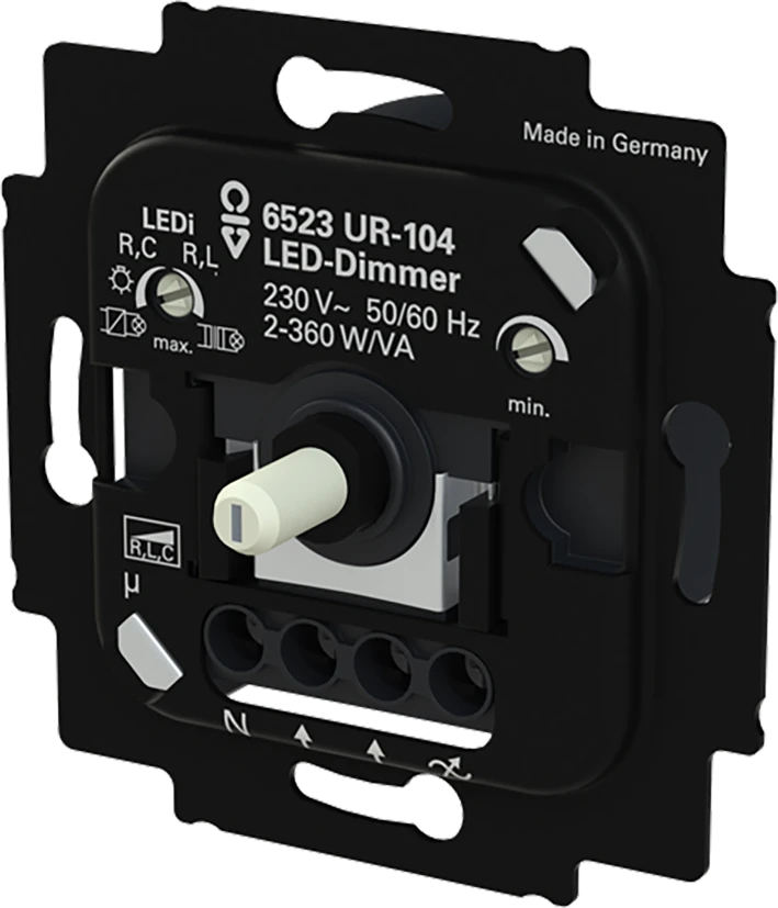 LED-dimmer met draaiknop. Met N-aansluitng. 2- of 3-draads aansluiting (nul niet vereist). Inbouwdiepte: < 20 mm, Nominale spanning: 230 V~, + 10% / - 10%, Nominaal vermogen (L): 2 - 100 W/VA, Nominaal vermogen (R, C): 10 - 360 W/VA (faseafsnijding)